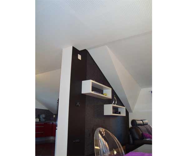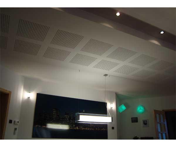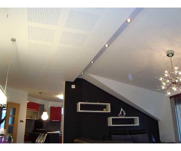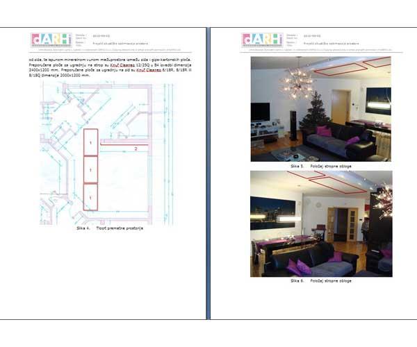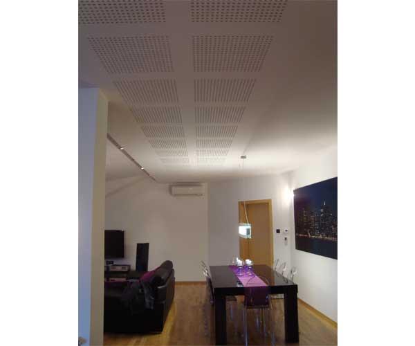 Projektno rješenje predviđa postavljanje perforiranih gips-kartonskih ploča na površine stropa i pregradnog zida. Rješenje je odabrano u dogovoru s naručiteljem, s ciljem što skladnijeg uklapanja u minimalistički uređen prostor.