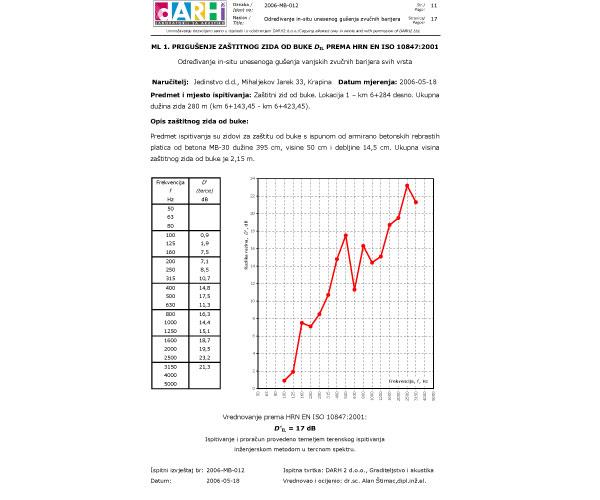 Po prvi puta u Republici Hrvatskoj, DARH 2 d.o.o. je za vodećeg hrvatskog proizvođača apsorbirajućih zaštitnih zidova od buke, Jedinstvo d.d., Krapina proveo određivanje in-situ unesenog gušenja zvučnih barijera na Autocesti Zagreb – Macelj, Dionica Zaprešić – Jankomir, lokacija Bestovje. Predmet ispitivanja su bili zidovi za zaštitu od buke s ispunom od armirano betonskih rebrastih platica od betona MB-30 dužine 395 cm, visine 50 cm i debljine 14,5 cm na kojim je bilo potrebno odrediti uneseno prigušenje zidova za zaštitu od buke prema zahtjevima metode HRN EN ISO 10847:2001 - Akustika – Određivanja in-situ unesenoga gušenja vanjskih zvučnih barijera svih vrsta. U navedenom mjerenju je korištena neizravna metoda mjerenja s umjetnim izvorom u skladu s zahjtevima HRN EN ISO 10847:2001, točka 4.2. |