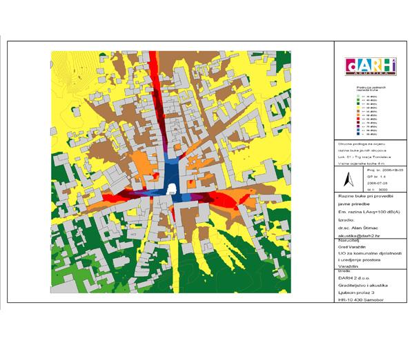 Za Grad Varaždin izrađena je stručna podloga za određivanje dopuštenih razina buke prilikom održavanja javnih skupova, razonode, zabavnih i drugih aktivnosti na području Grada Varaždina. Grad Varaždin je odredio 7 lokacija na kojima se najčešće organiziraju javni skupovi za koje su akustičkim metodama prognoziranja razina buke određena područja prema zahtjevima Čl. 16, Zakona o zaštiti od buke (NN 20/03). Navedene lokacije uključene u stručnu podlogu su: - Trg kralja Tomislava, - Stari grad, - Kapucinski trg, - Kazališni trg, - Trg Miljenka Stančića, - Trg bana J. Jelačića i - Stadion NK "Varteks“.