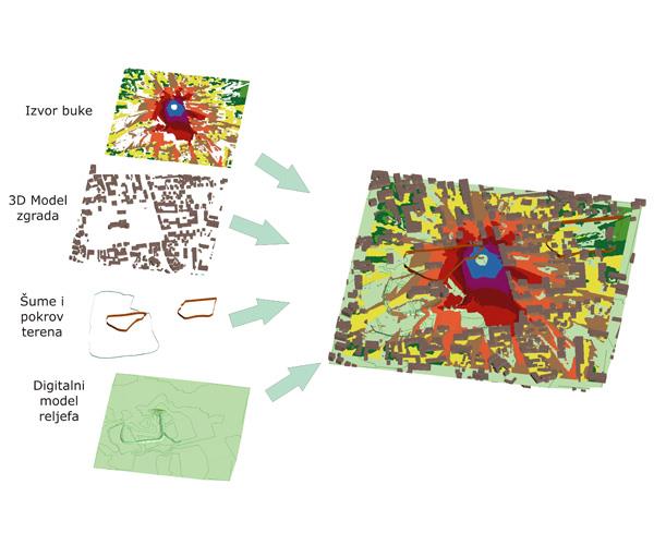 Metodologija izrade računalnog akustičkog modela buke javnih skupova preuzeta je iz smjernice 2002/49/EC – “Relating to the assessment and management of environmental noise” , kao i preporuke Europske Komisije 2003/613/EC od 2003-08-06 “Guidelines on the revised interim computation methods for industrial noise, aircraft noise, road traffic noise and railway noise, and related emission data”. Za potrebe ove studije, korištena je EU preporučena računalna metoda HRN EN ISO 9613-2:2000 - Prigušenje zvuka pri širenju na otvorenom -- 2. dio: Opća metoda proračuna. Navedena stručna podloga koristila je vrlo detaljne zemljopisne podatke kao i podatke o izvorima buke. Na temelju rezultata proračuna i prostornog planskog dokumenta izrađena su 'konfliktna područja' koja su zapravo i cilj ove stručne podloge. |
